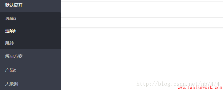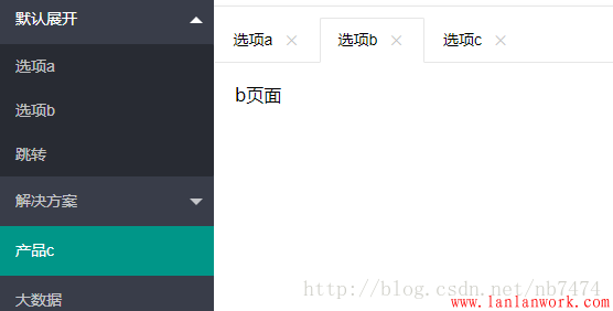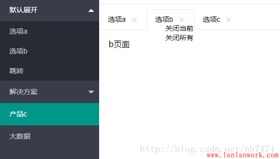 <div class="layui-tab layui-tab-card site-demo-button" style="position: relative;"> <ul class="layui-nav layui-nav-tree layui-nav-side"> <li class="layui-nav-item layui-nav-itemed"> <a href="javascript:;">默認(rèn)展開(kāi)</a> <dl class="layui-nav-child"> <dd> <a data-url="a" data-id="11" data-title="選項(xiàng)a" href="#" class="site-demo-active" data-type="tabAdd">選項(xiàng)a</a> </dd> <dd> <a href="#" data-url="b" data-title="選項(xiàng)b" data-id="22" class="site-demo-active" data-type="tabAdd">選項(xiàng)b</a> </dd> <dd> <a href="">跳轉(zhuǎn)</a> </dd> </dl> </li> <li class="layui-nav-item"> <a href="javascript:;">解決方案</a> <dl class="layui-nav-child"> <dd> <a href="">移動(dòng)模塊</a> </dd> <dd> <a href="">后臺(tái)模版</a> </dd> <dd> <a href="">電商平臺(tái)</a> </dd> </dl> </li> <li class="layui-nav-item"> <a href="#" data-url="c" data-title="選項(xiàng)c" data-id="33" class="site-demo-active" data-type="tabAdd">產(chǎn)品c</a> </li> <li class="layui-nav-item"> <a href="">大數(shù)據(jù)</a> </li> </ul> <div class="layui-tab" lay-filter="demo" lay-allowclose="true" style="margin-left: 200px;"> <ul class="layui-tab-title"> </ul> <ul class="rightmenu" style="display: none;position: absolute;"> <li data-type="closethis">關(guān)閉當(dāng)前</li> <li data-type="closeall">關(guān)閉所有</li> </ul> <div class="layui-tab-content"> </div> </div> </div>js代碼:
