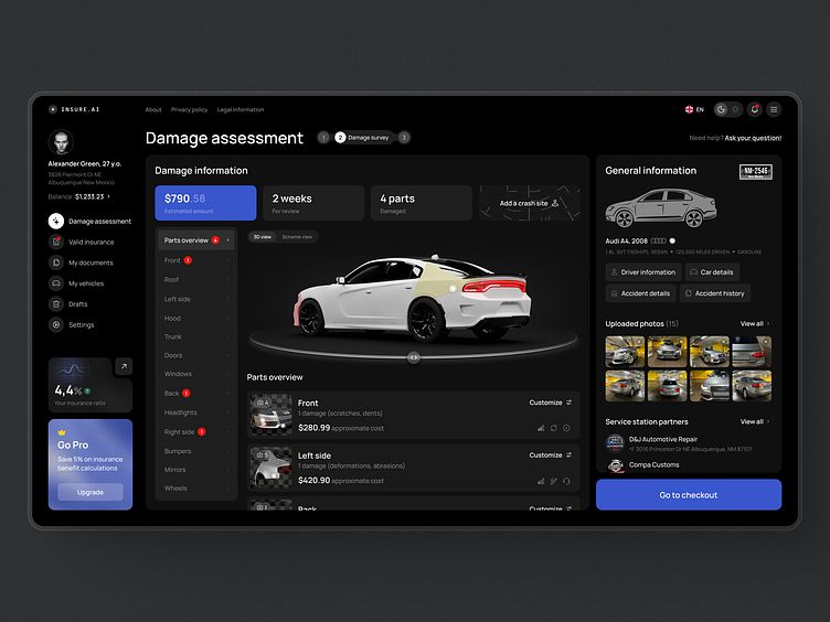 汽車定損專業(yè)性強,UI 既要體現(xiàn)嚴謹,又要降低用戶理解門檻。設計中,汽車 3D 模型可交互查看,受損部位色彩標注清晰,定損金額、維修時長等信息一目了然。深色界面搭配藍色操作按鈕,既符合專業(yè)場景調性,又通過色彩引導操作流程。這給我們的啟發(fā)是:專業(yè)場景的 UI,不是要 “拒人千里”,而是要通過設計,把專業(yè)內容 “友好地” 呈現(xiàn)給用戶,蘭亭妙微在這類項目中,也會深入調研業(yè)務流程,讓設計為 “專業(yè)” 賦能,而非添堵。