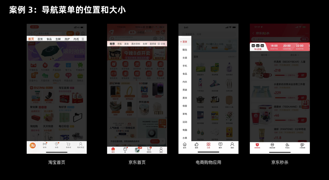 導(dǎo)航是用戶高頻操作的模塊,它的位置和大小直接影響瀏覽效率。菲茲定律在這里的應(yīng)用重點是 “縮短距離”—— 把導(dǎo)航放在用戶手指或視線最容易到達的地方。