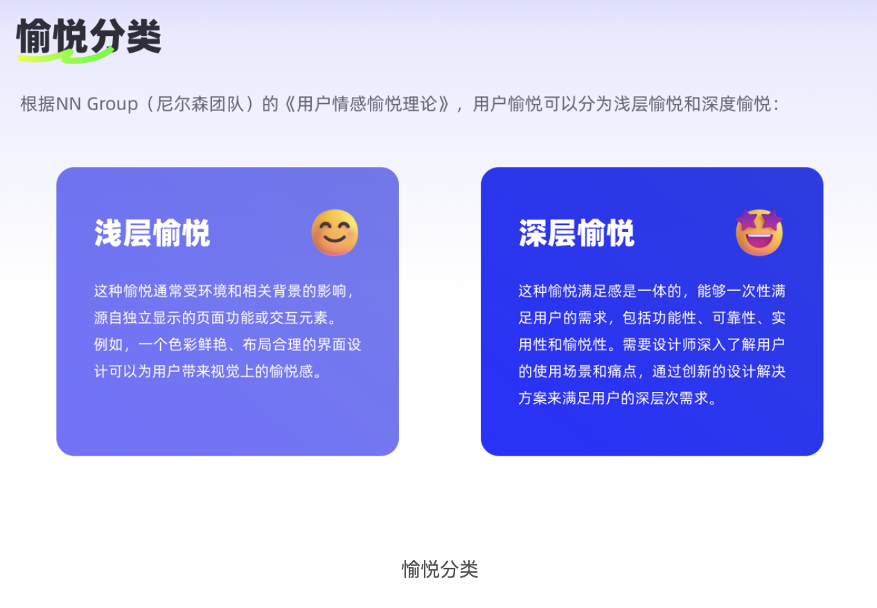 根據(jù)尼爾森團隊的《用戶情感愉悅理論》,設(shè)計帶來的愉悅感分為兩種,二者的價值和實現(xiàn)方式截然不同,混淆它們很容易讓設(shè)計 “浮于表面”。