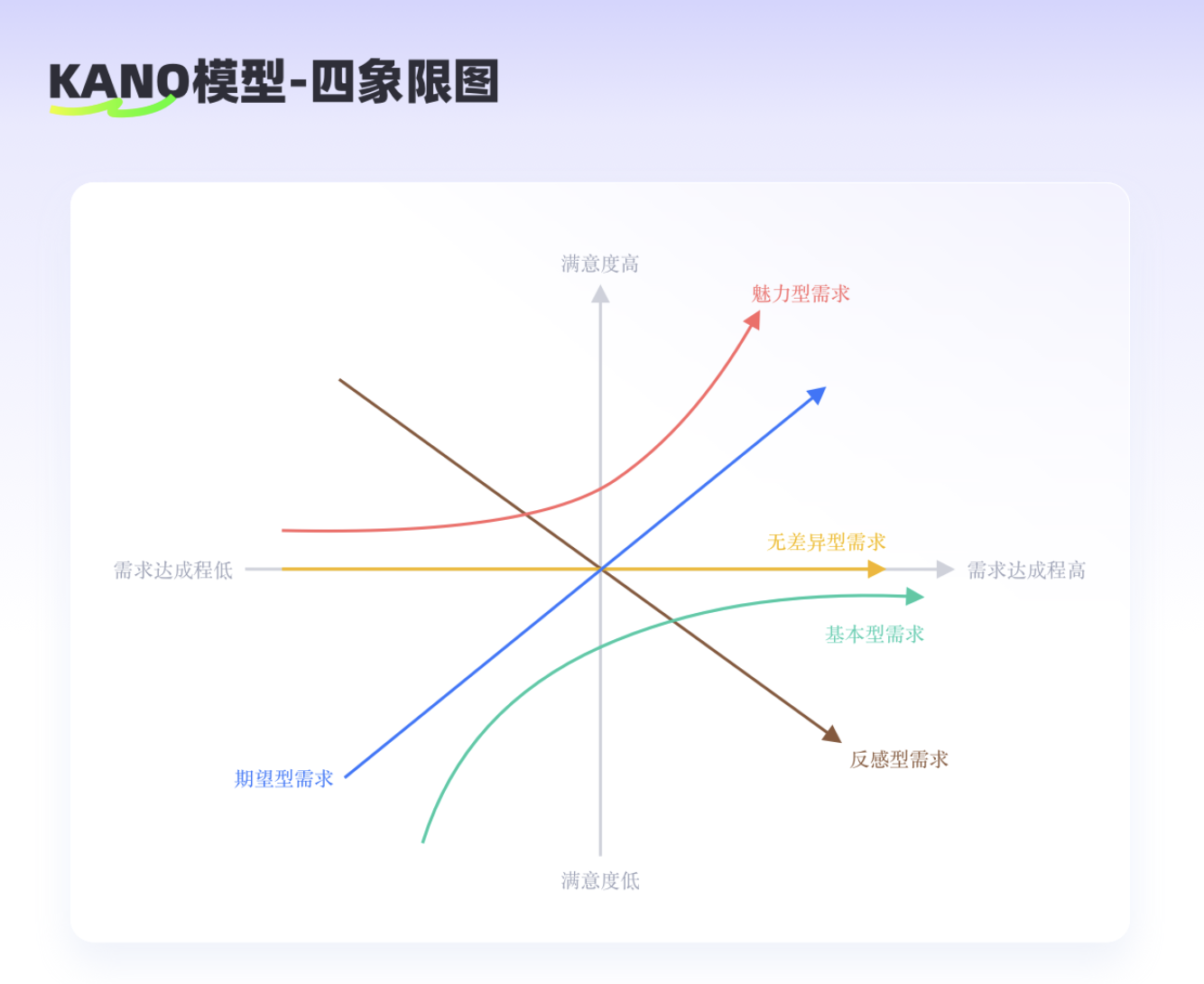 想做好愉悅感設(shè)計,首先要明白:不是所有功能都能帶來愉悅,只有找對 “用戶真正在意的需求”,才能避免 “費力不討好”。東京理工大學(xué)狩野紀(jì)昭教授提出的 Kano 模型,能幫我們理清需求的優(yōu)先級,找到愉悅感的發(fā)力點。