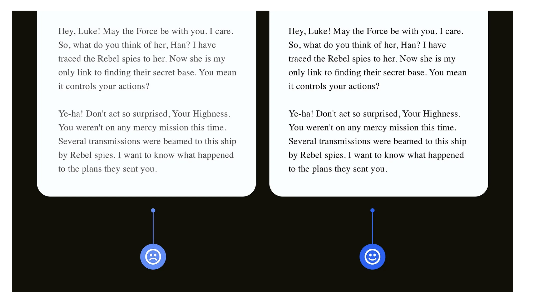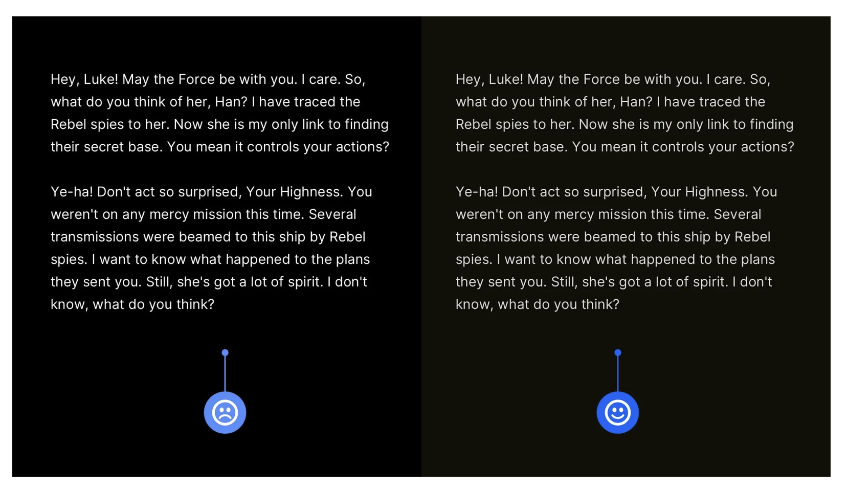優(yōu)化方法很簡單:將深色背景從 “純黑” 改為 “深灰(如 #1A1A1A)”,純白文字的不透明度調(diào)整為 85%-90%(如 #FFFFFFE0)。這種調(diào)整不會(huì)影響視覺美觀,卻能讓散光用戶(數(shù)量遠(yuǎn)超預(yù)期)更舒適地使用產(chǎn)品,提升留存率。